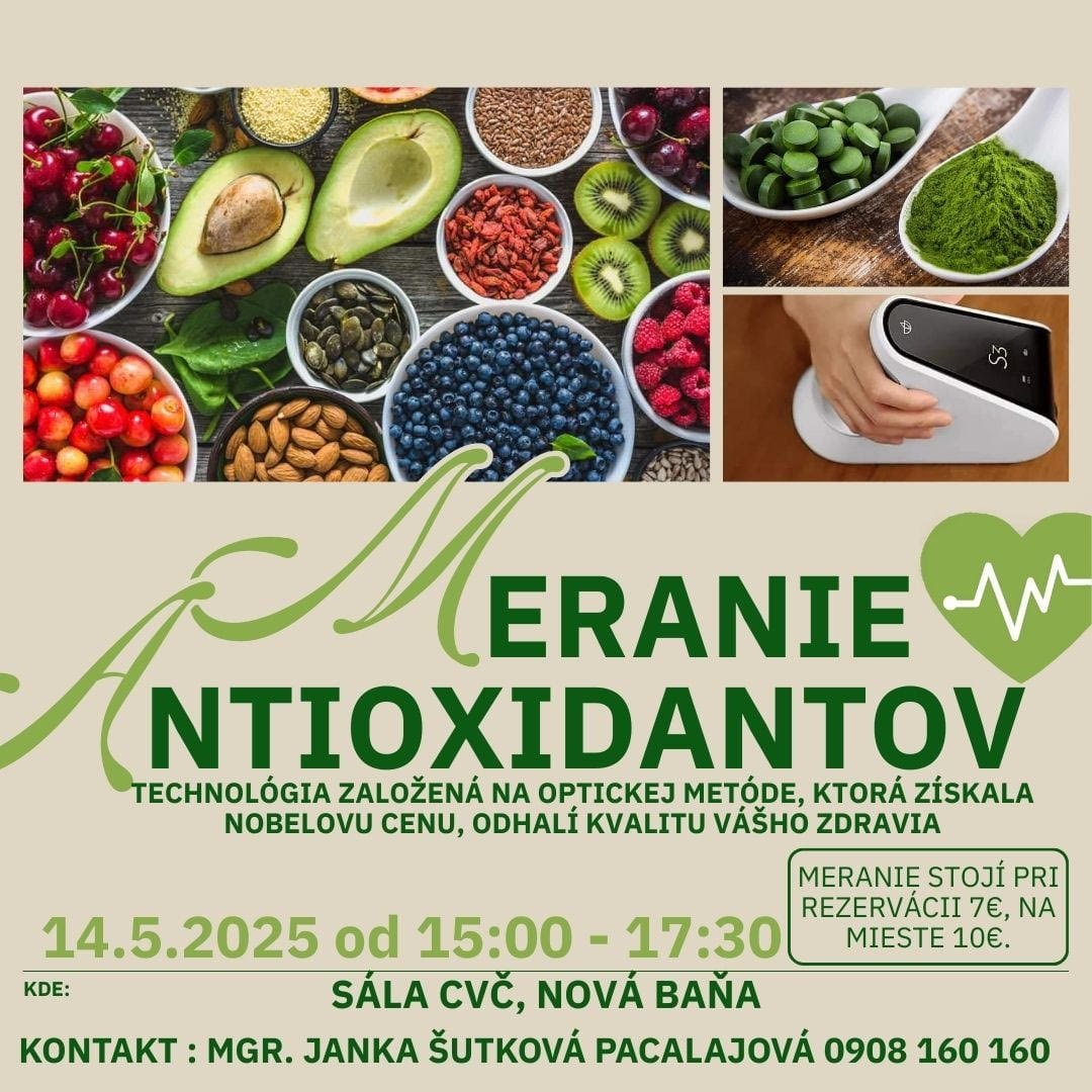 ⏱️ Čas čítania: 1 min (27 slov) *Meranie antioxidantov, Nová Baňa, 14.05.2025 v CVČ, 15,00 – 17,30 *rezervácia 7 €, na mieste 10 €, * možnosť ochutnať zelený jačmeň, chlorellu a farebnáče, * počet miest je limitovaný,