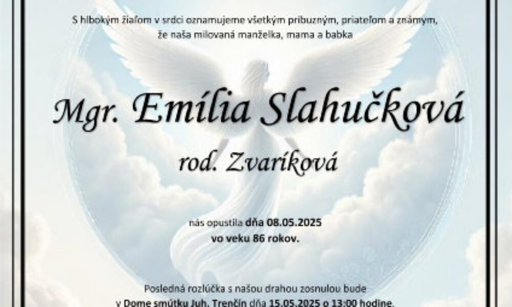 ⏱️ Čas čítania: 1 min (43 slov) S hlbokým žiaľom oznamujeme všetkým príbuzným, priateľom a známym, že Mgr. Emília Slahučková rod. Zvaríková nás opustil(a) dňa: 08.05.2025, vo veku 86 rokov. Posledná rozlúčka sa uskutoční dňa: 15.05.2025.