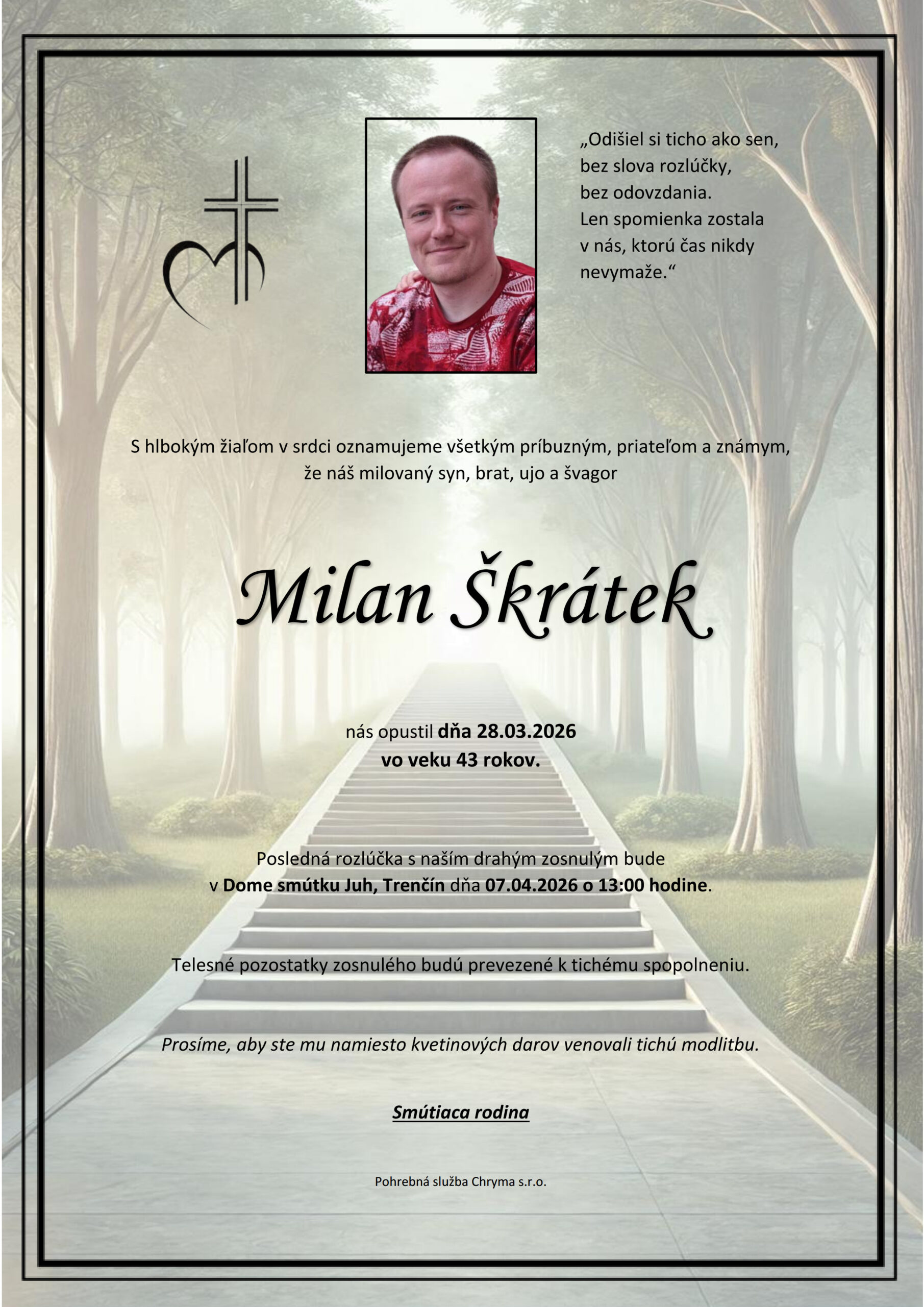 S hlbokým žiaľom oznamujeme všetkým príbuzným, priateľom a známym, že Milan Škrátek nás opustil(a) dňa: 25.03.2026, vo veku 43 rokov. Posledná rozlúčka sa uskutoční dňa: 07.04.2026.