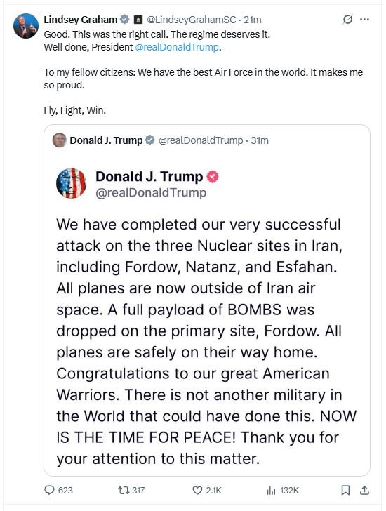 „Dokončili jsme náš velmi úspěšný útok na tři jaderné elektrárny v Íránu, včetně Fordo, Natanzu a Esfahánu. Všechna letadla jsou nyní mimo íránský vzdušný prostor. Plný náklad bomb byl shozen na primární základnu Fordo. Všechna letadla jsou bezpečně na cestě domů.
