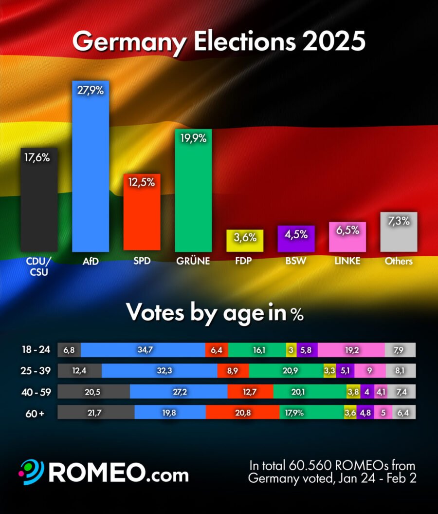 V červnu 2024 měla AfD u gayů 22,3 procenta – těsně před Unií (20,6 procenta) a Zelenými (20,5 procenta). Následovaly je SPD (13,9 procenta), BSW (7,0), Levicová strana (6,0) a FDP (4,8). V té době se průzkumu zúčastnilo 10 000 gayů.