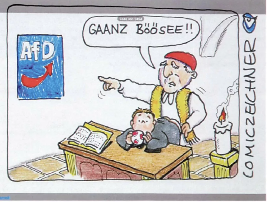 Satirik zde možná naráží na to, že církev před časem vyloučila členy AfD, zatímco v pozadí se předtím řešily rozsáhlé případy pedofilních duchovních.