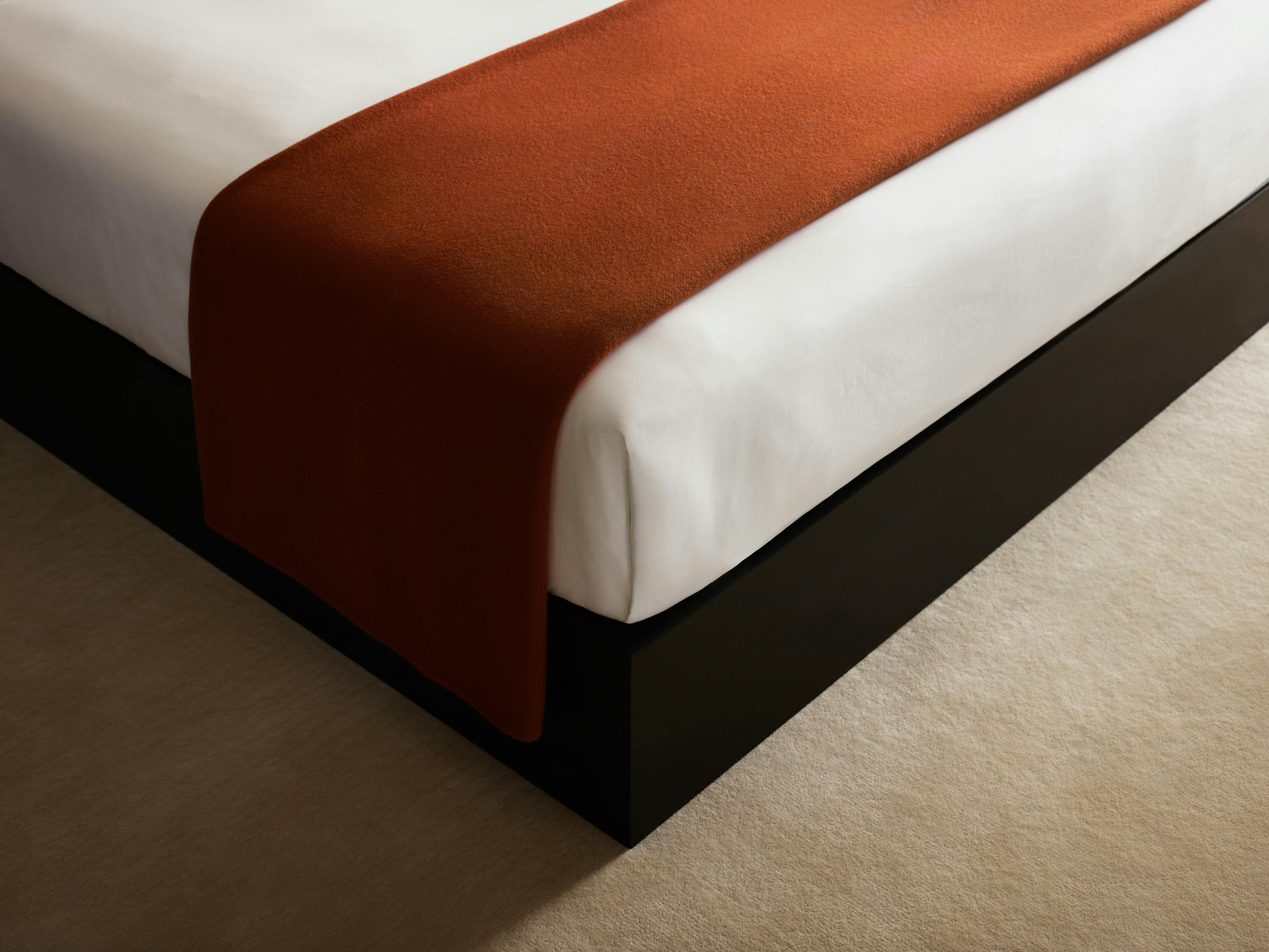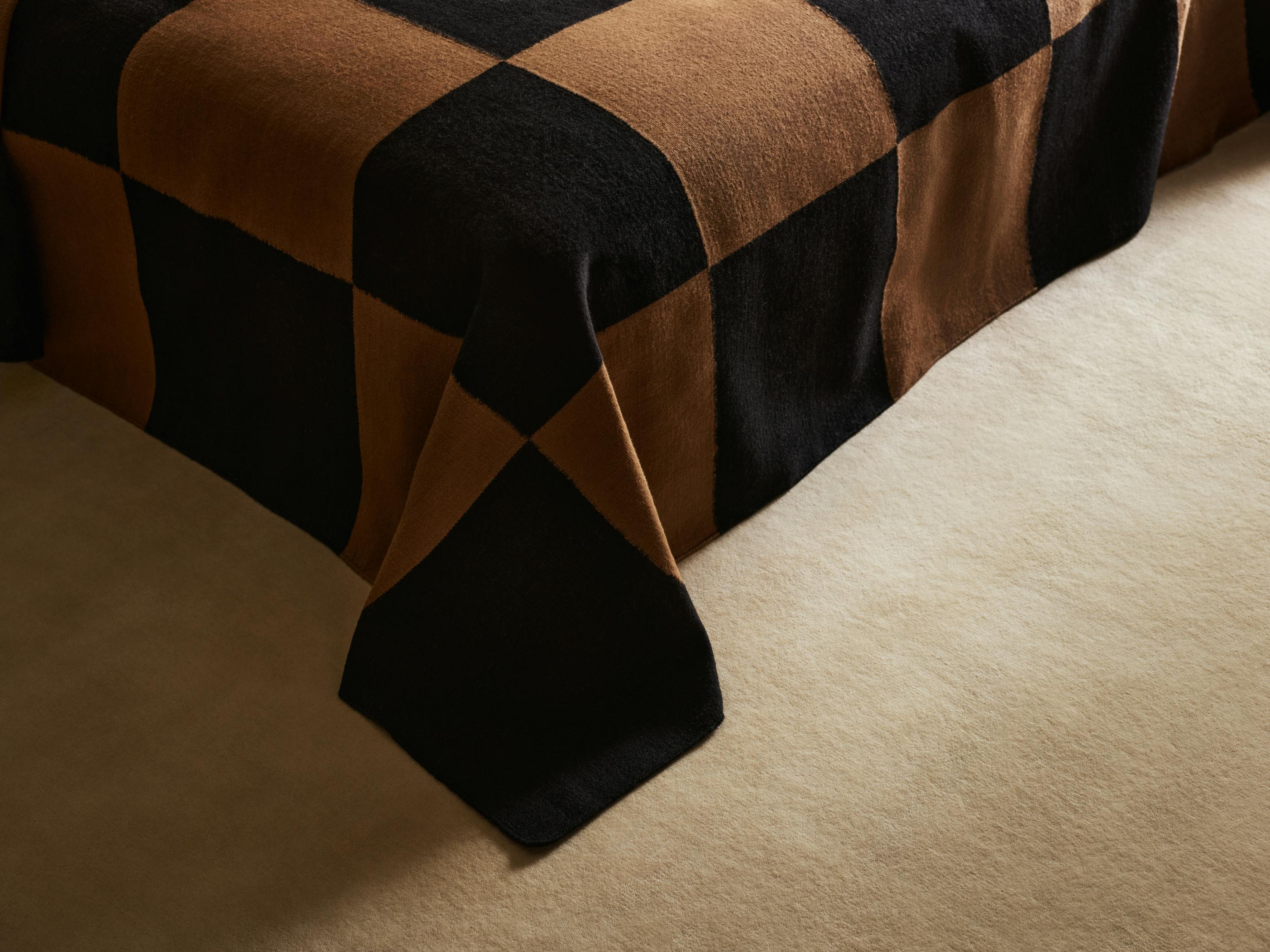 Textiles form the heart of the offering. Bedding comes in crisp percale and fluid sateen, both woven from Egyptian cotton and finished in understated tones with subtle detailing. Layered on top are cashmere-wool throws, densely woven linen bedspreads, and patterned flatweaves that nod to the brand’s rug-making roots.