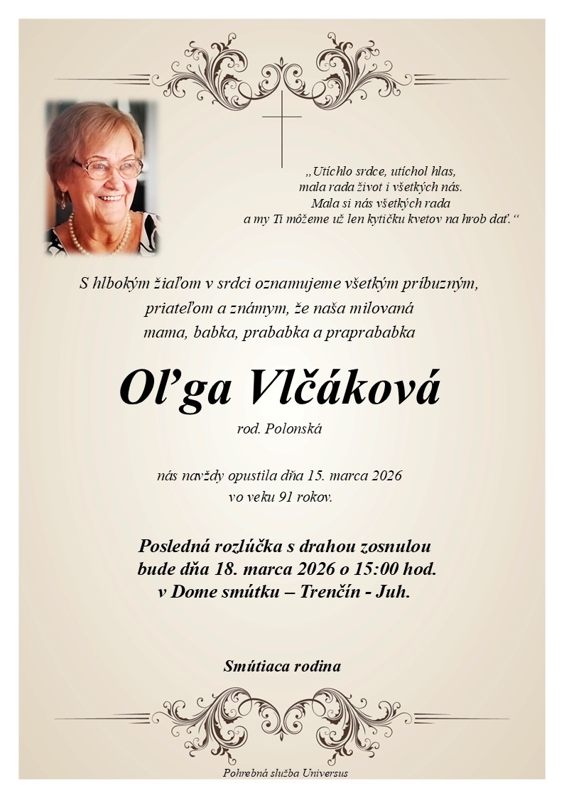 S hlbokým žiaľom oznamujeme všetkým príbuzným, priateľom a známym, že Oľga Vlčáková nás opustil(a) dňa: 15.03.2026, vo veku 91 rokov. Posledná rozlúčka sa uskutoční dňa: 18.03.2026.