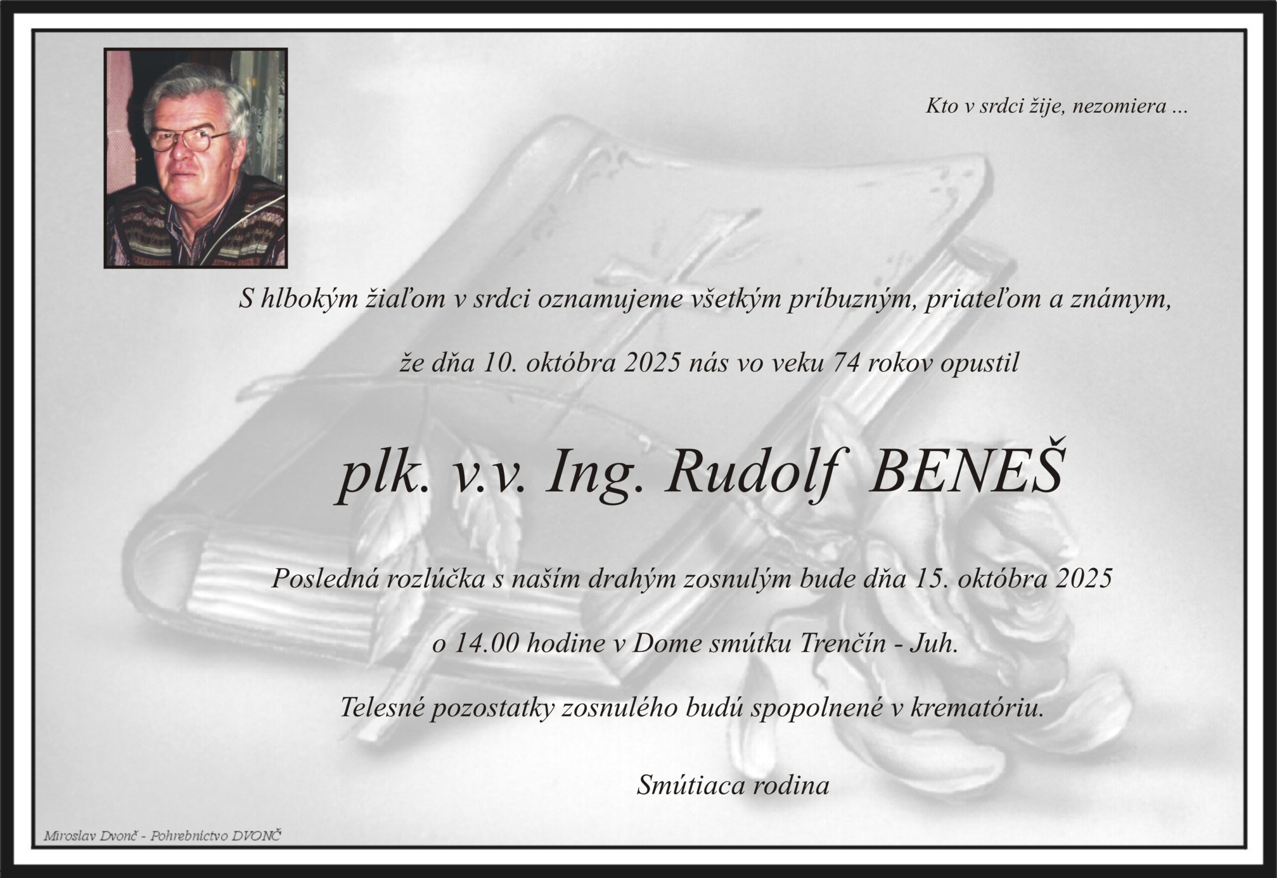 S hlbokým žiaľom oznamujeme všetkým príbuzným, priateľom a známym, že plk.v.v. Ing. Rudolf Beneš nás opustil(a) dňa: 10.10.2025, vo veku 74 rokov. Posledná rozlúčka sa uskutoční dňa: 15.10.2025.