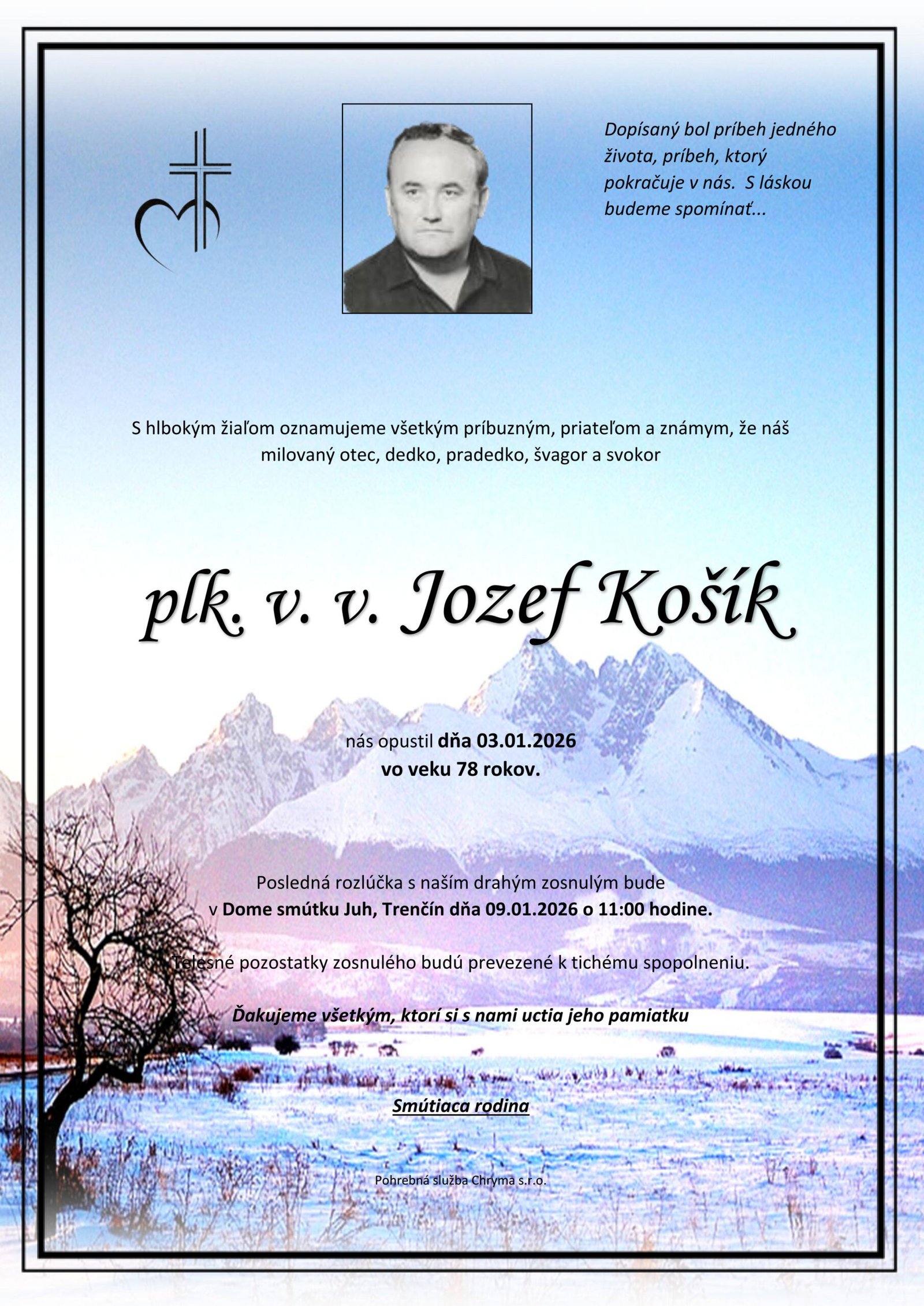 ⏱️ Čas čítania: 1 min (41 slov) S hlbokým žiaľom oznamujeme všetkým príbuzným, priateľom a známym, že plk. v. v. Jozef Košík nás opustil(a) dňa: 03.01.2026, vo veku 78 rokov. Posledná rozlúčka sa uskutoční dňa: 09.01.2026.