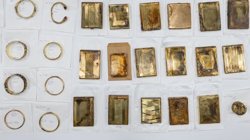 Dvě nalezené schránky obsahovaly zlaté mince, šperky a další předměty o celkové hmotnosti sedm kilogramů. Ryzost nalezeného zlata po převzetí nálezu deklaroval i kurátor numismatické sbírky MVČ Vojtěch Brádle. „Nejistota panovala u ostatních nemincovních předmětů, kterých bylo analýze podrobeno celkem 34. Testy potvrdily, že zlaté jsou bezezbytku všechny. Jedná se o více kusů rozdílných cigaretových pouzder, dámské šperky, ale také o jednotlivosti, jako například o dvojdílný kapesní hřeben, pudřenku či dámskou plesovou taštičku,“ sdělila mluvčí MVČ Lucie Peterková.
