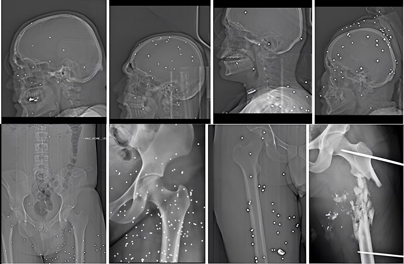 Každá z týchto bodiek však predstavuje kovový brok s veľkosťou niekoľkých milimetrov, ktorý uviazol hlboko v mäkkých tkanivách tváre, v očných jamkách, dokonca aj v mozgu.