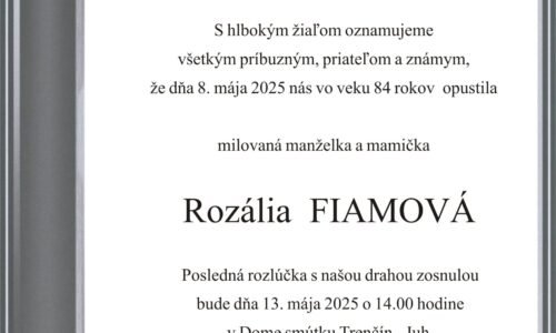 ⏱️ Čas čítania: 1 min (38 slov) S hlbokým žiaľom oznamujeme všetkým príbuzným, priateľom a známym, že Rozália Fiamová nás opustil(a) dňa: 08.05.2025, vo veku 84 rokov. Posledná rozlúčka sa uskutoční dňa: 13.05.2025.