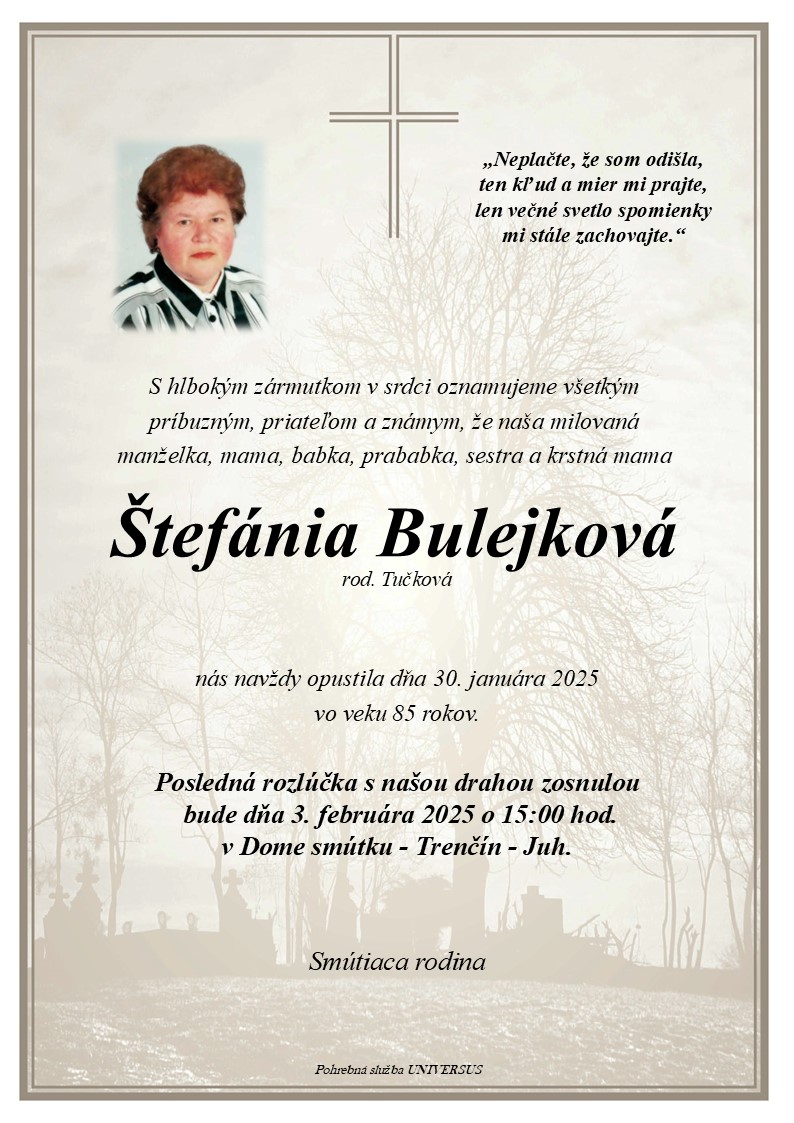 ⏱️ Čas čítania: 1 min (38 slov) S hlbokým žiaľom oznamujeme všetkým príbuzným, priateľom a známym, že Štefánia Bulejková nás opustil(a) dňa: 30.01.2025, vo veku 85 rokov. Posledná rozlúčka sa uskutoční dňa: 03.02.2025.