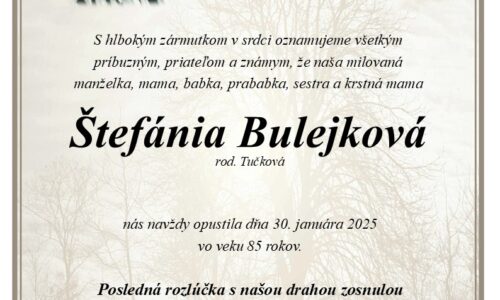⏱️ Čas čítania: 1 min (38 slov) S hlbokým žiaľom oznamujeme všetkým príbuzným, priateľom a známym, že Štefánia Bulejková nás opustil(a) dňa: 30.01.2025, vo veku 85 rokov. Posledná rozlúčka sa uskutoční dňa: 03.02.2025.