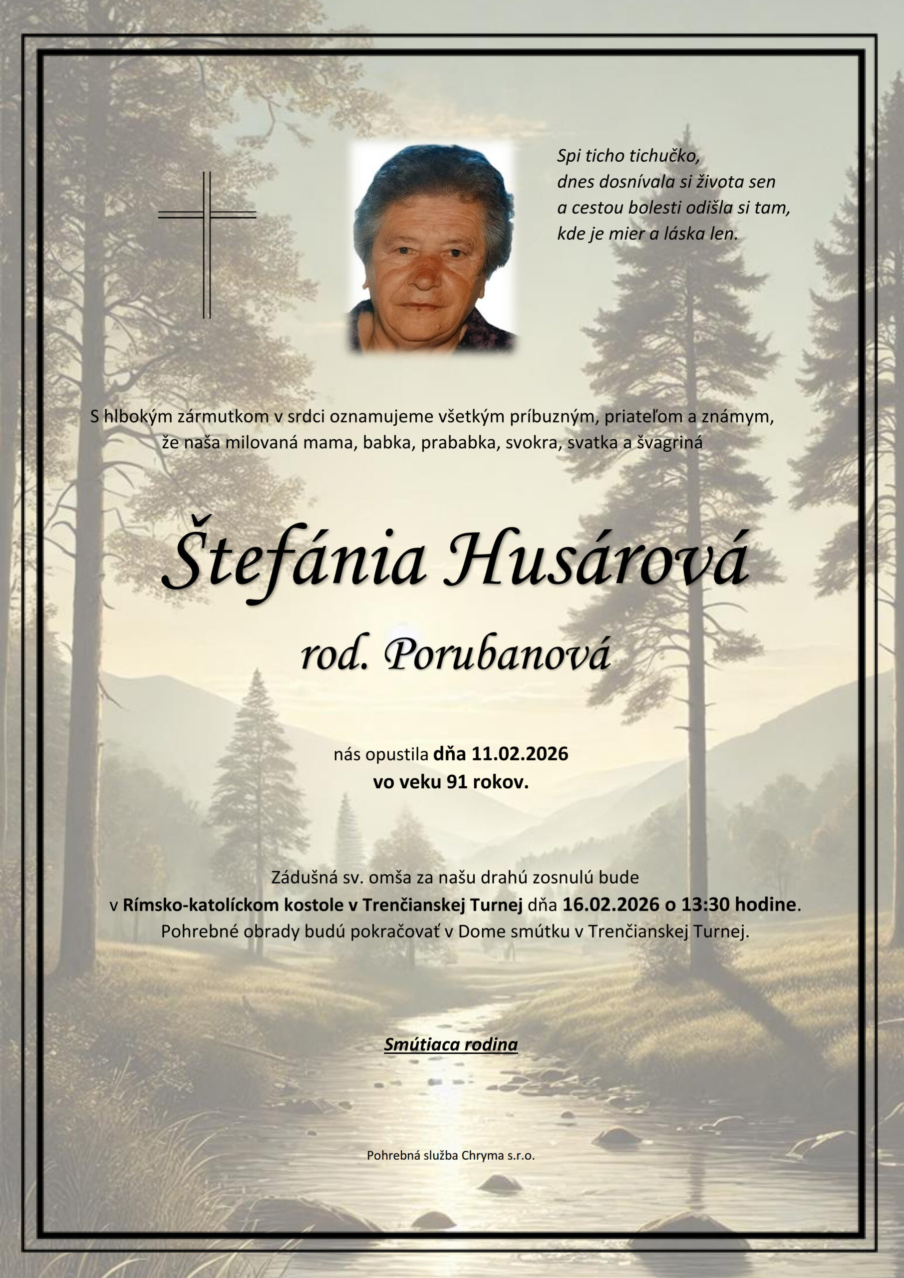 S hlbokým žiaľom oznamujeme všetkým príbuzným, priateľom a známym, že Štefánia Husárová rod. Porubanová nás opustil(a) dňa: 11.02.2026, vo veku 91 rokov. Posledná rozlúčka sa uskutoční dňa: 16.02.2026.