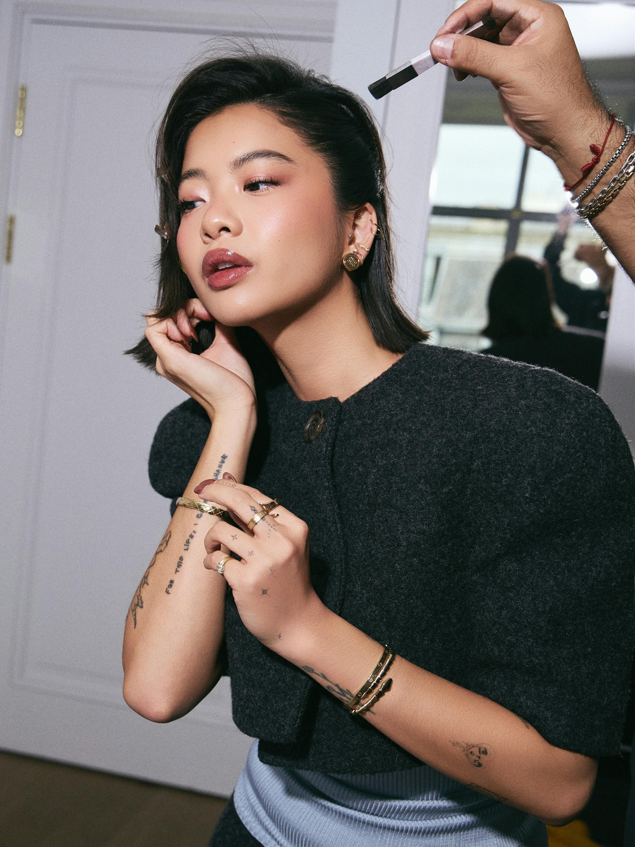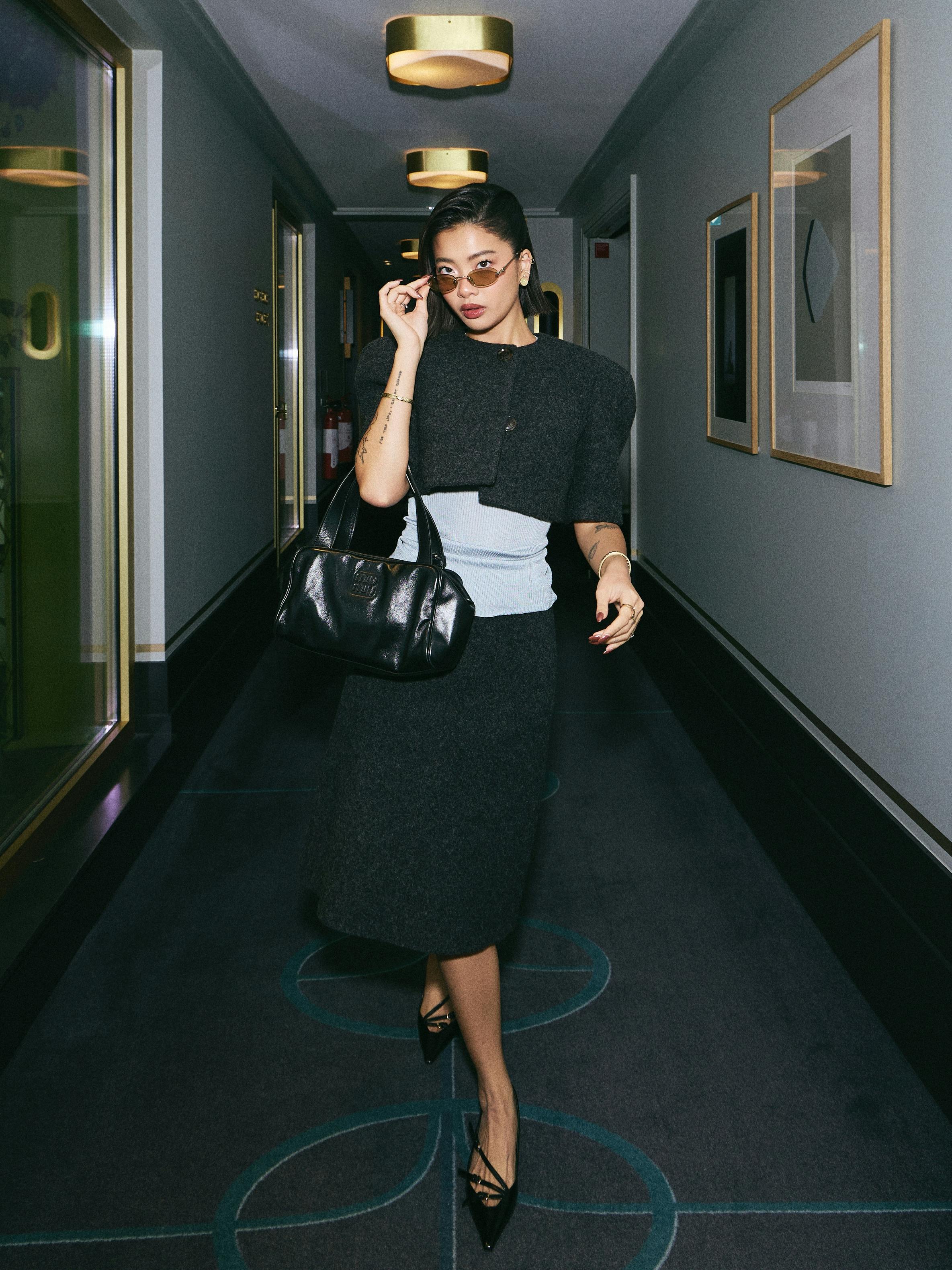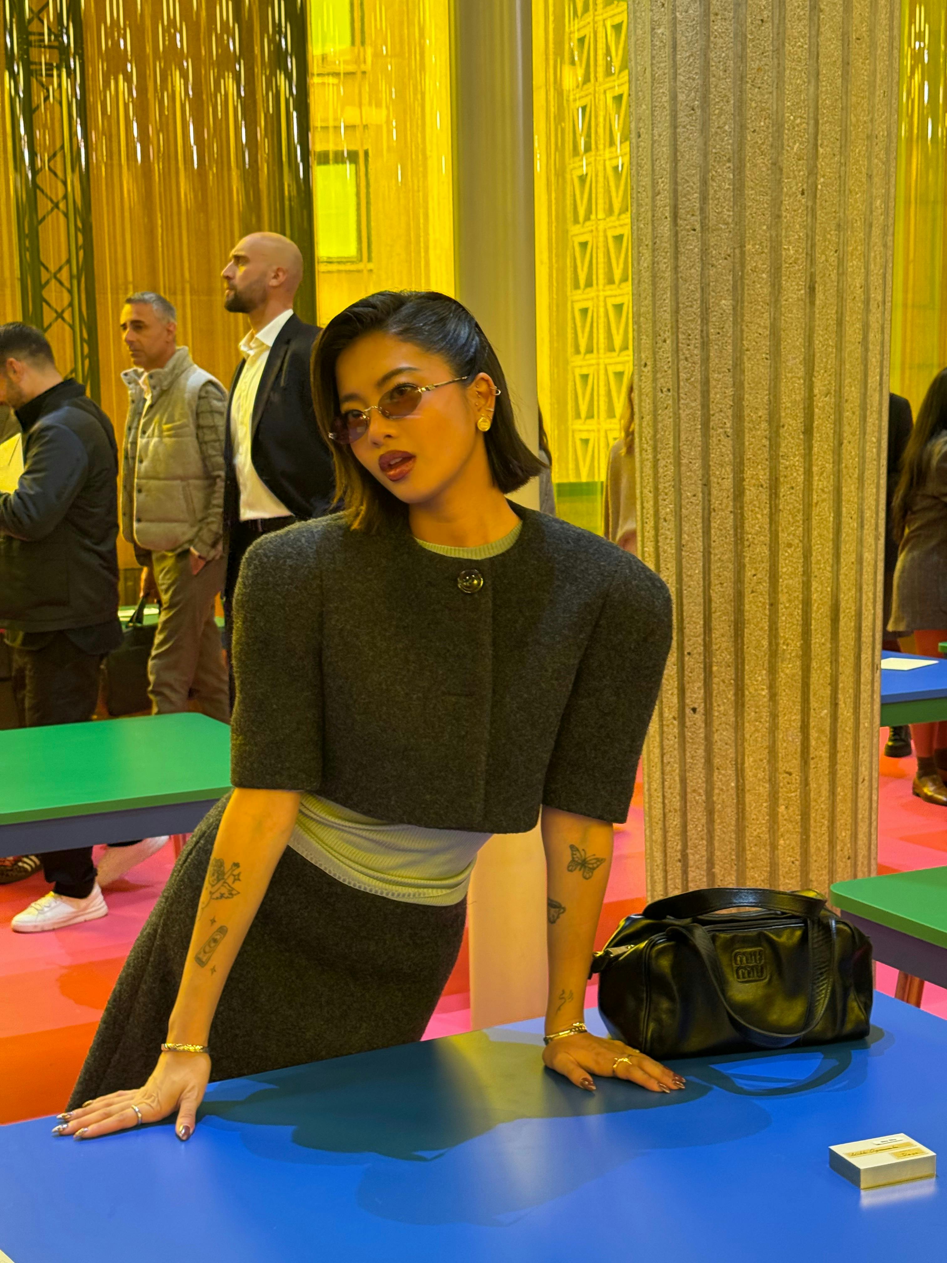 Over the course of the past week, Steph Hui has been a veritable style chameleon, shifting between colors, aesthetics, and silhouettes as she flitted from show to show. But for Miu Miu, she settled on an audacious charcoal gray blazer and skirt, accented by a sleek handbag and polished kitten heels. Her iconic bob—which, in Paris, seems right at home—appeared perfectly styled, and her makeup, effortlessly glowy. All in all? Sophisticated, spirited, and playfully polished—the ultimate Miu Miu girl.