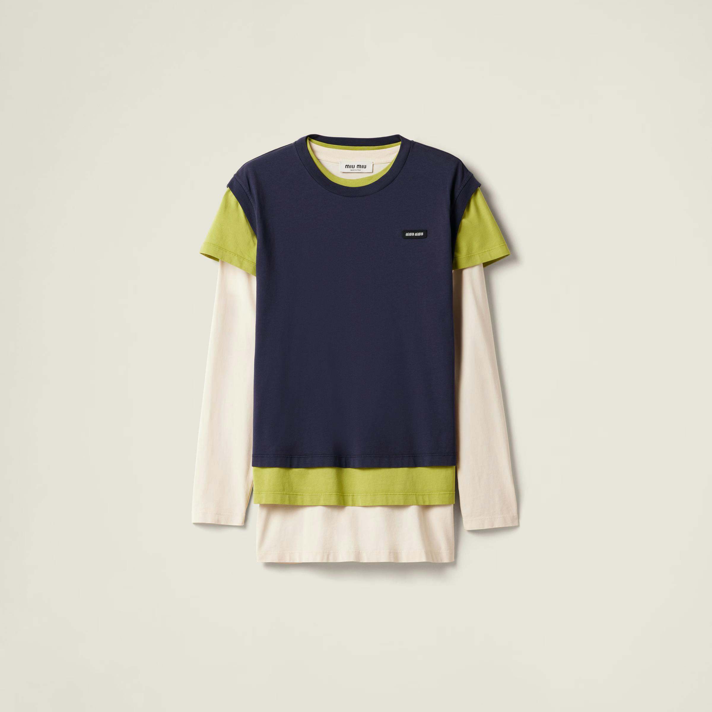 The ultimate master of cool, Miu Miu, spearheads this layering tees trend. First shown on the Spring/Summer 2023 runways, Miu Miu’s set of 3 t-shirts soon became a core product offering for the brand. Available in four different colorways—from neutral greys to soft pinks—this set can be worn together or separately, (almost) justifying its $1,590 price tag.