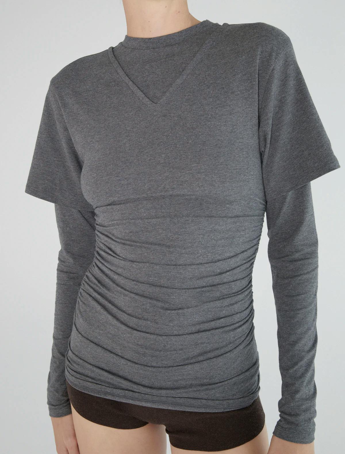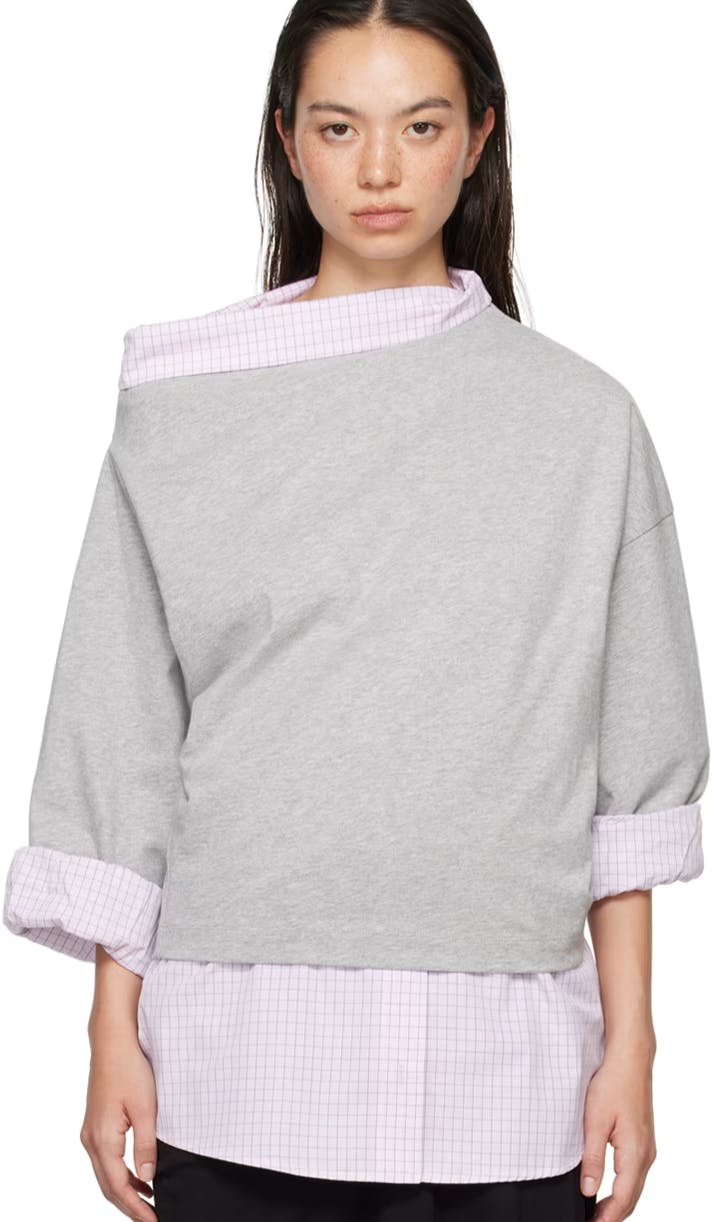 Because there’s never a dull moment for Dries Van Noten, the brand’s take on the layered tee trend is nothing short of standout. The base layer features a checked poplin shirt—proving that prints are also welcome in the layering conversation. The top layer, on the other hand, offers playful contrast, with an asymmetric grey t-shirt that completes the layered construction.