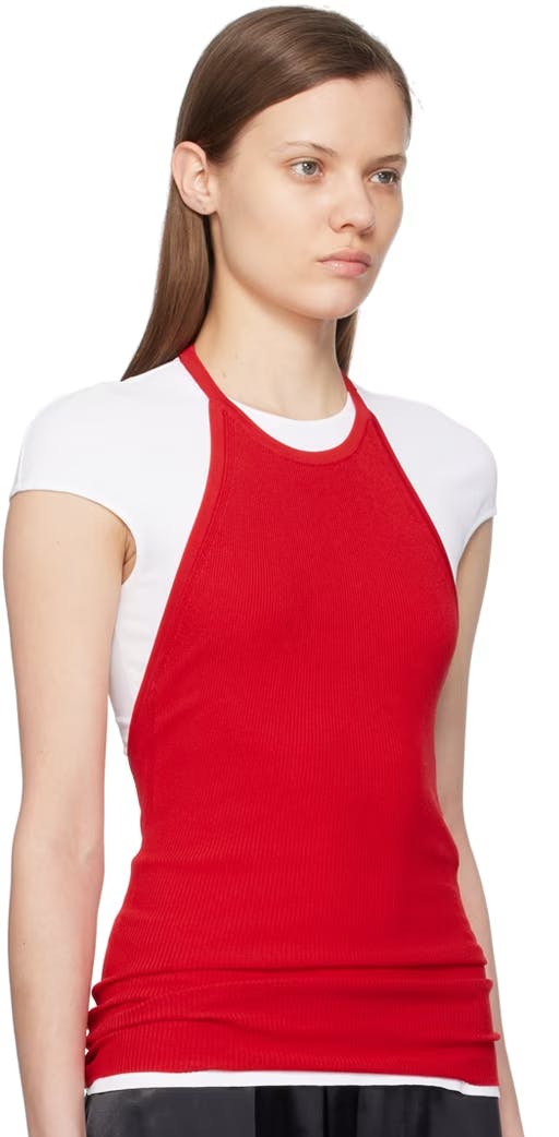 Leave it to Ferragamo to come up with the most luxe take on layering tees. Featuring a bright red knit over a white polyester t-shirt, the combination of the halter straps with the crewneck cut creates a luxurious silhouette to wear from day to night. To pair with everything from leather midi skirts to casual jeans, this top is as flattering as it is chic.