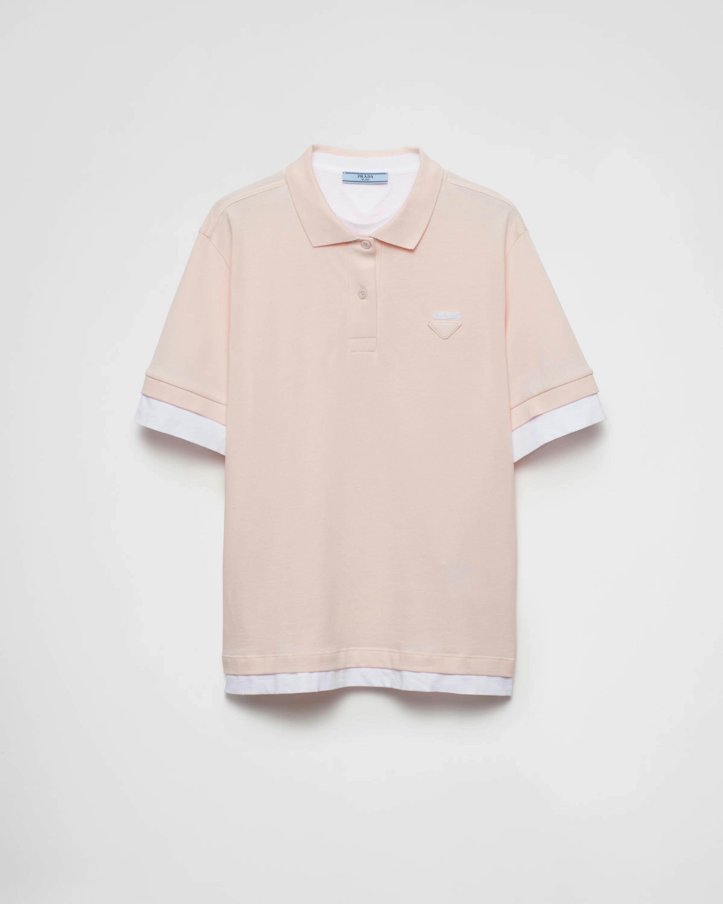 We saw the tees and we saw the tanks—now it’s time for Prada to bring the polos into the conversation. Introducing some sporty energy into the layering trend, this oversized style combines a baby pink piqué polo shirt with white jersey trimming. Perfect for the more androgynous dressers, this top is finished with the emblematic Prada triangle logo for a final touch of luxe.