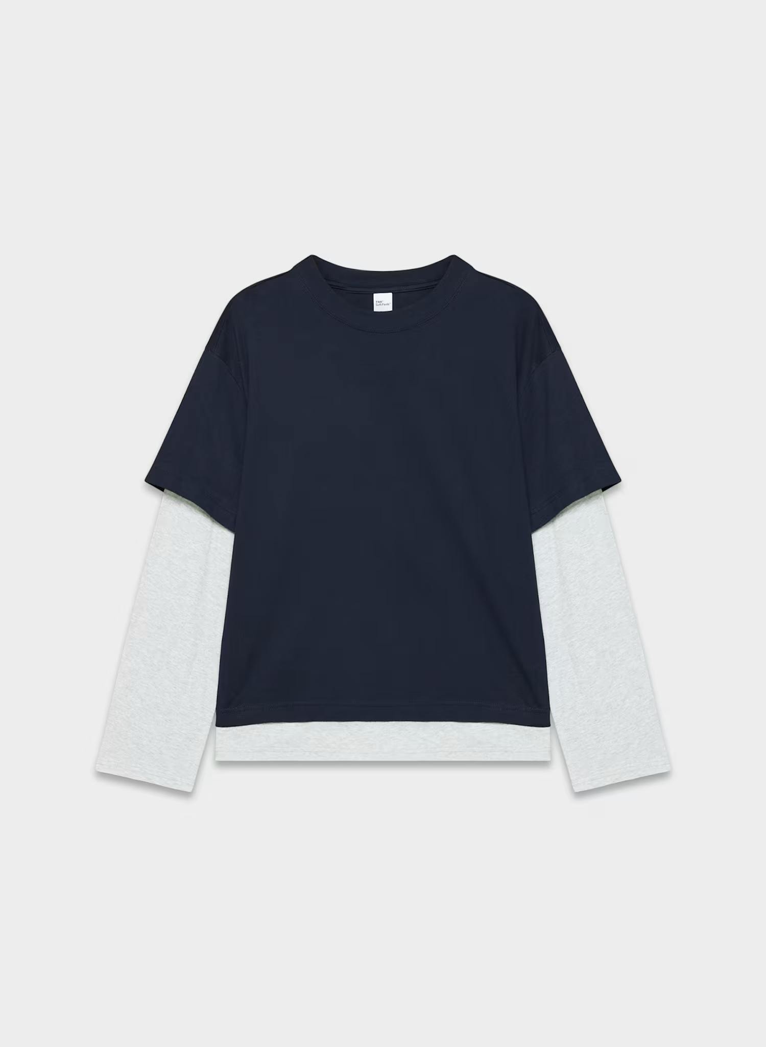 Another relaxed take on this versatile trend, Aritzia brings its signature basics to the layering scene. Blending a casual bone grey hue with a timeless navy blue, this everyday must-have is crafted in naturally breathable 100% cotton. Featuring an oversized cut and an easy drape, this is the perfect fall weekend fit for those days when ditching your sweats feels like an impossible task.