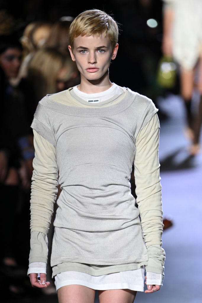 The ultimate master of cool, Miu Miu, spearheads this layering tees trend. First shown on the Spring/Summer 2023 runways, Miu Miu’s set of 3 t-shirts soon became a core product offering for the brand. Available in four different colorways—from neutral greys to soft pinks—this set can be worn together or separately, (almost) justifying its $1,590 price tag.