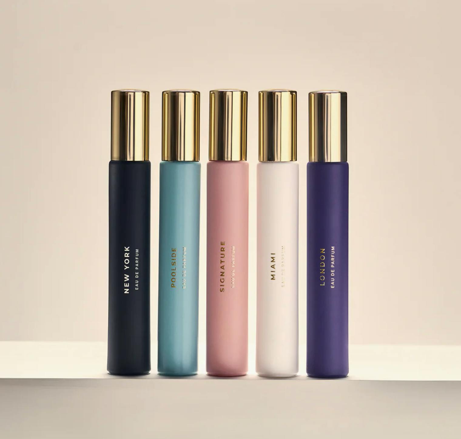 Each perfume reimagines its candle counterpart with a skin-hugging sensibility. New York leans sultry with suede, musk, and amber; London softens into a lavender-vanilla gourmand; Miami radiates with jasmine, white tea, and blonde woods; Poolside brings a sparkling mix of neroli, sea salt, and sunlit citrus; and Signature offers a clean, subtly luxurious blend of musk, sandalwood, and cashmere woods. All five launch as $48 travel-size EDPs—an approachable entry into fine fragrance and a fitting nod to the brand’s wanderlust roots.