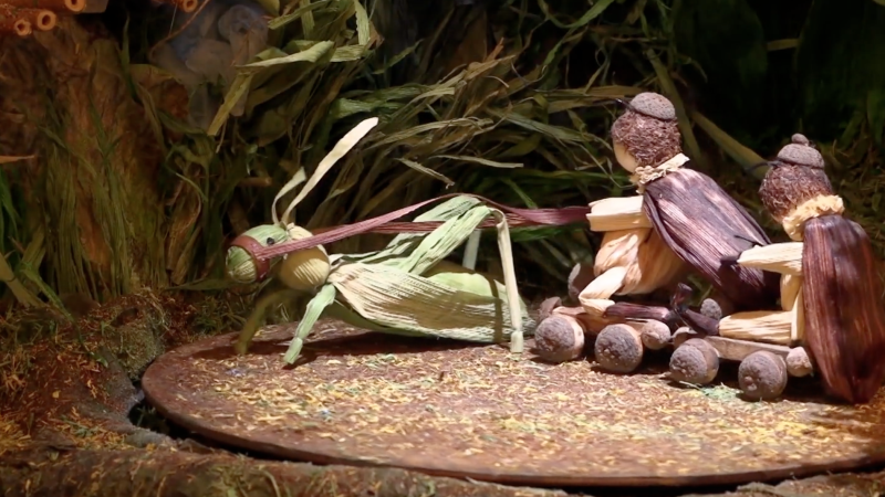 Dalším záměrem tvůrkyně bylo ukázat lidem, co z listů kukuřičných klasů může vzniknout. „Pro svoji tvorbu používám pouze listy z plodu, který je jimi obalen. Když se obarví tou nejobyčejnější barvou na bavlnu, vznikají z toho krásné květiny, prostě všechno. Scéna je dekorovaná právě materiálem z listů kukuřice. Zajímavý je třeba orobinec, který je pro změnu z blizny, lidé tomu říkají ledové vousy. Ta blizna, když se rozmixuje, je z ní hnědý prášek. To je takový náhled třeba pro další výtvarníky, co všechno tenhle materiál umožňuje,“ říká Šustrová.