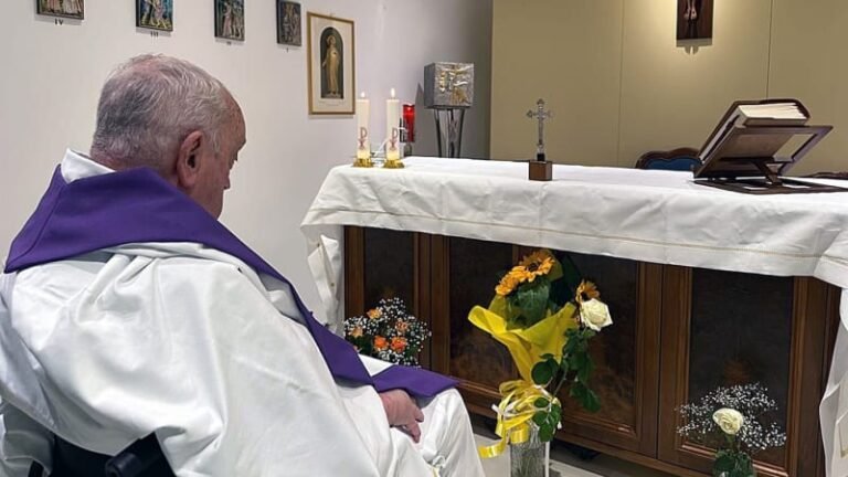 V neděli večer pak Vatikán zveřejnil první snímek z papežova pobytu v nemocnici. Františka, kterému není plně vidět do tváře, fotografie zachycuje zezadu, jak sedí před oltářem při mši v kapli Gemelliho nemocnice.