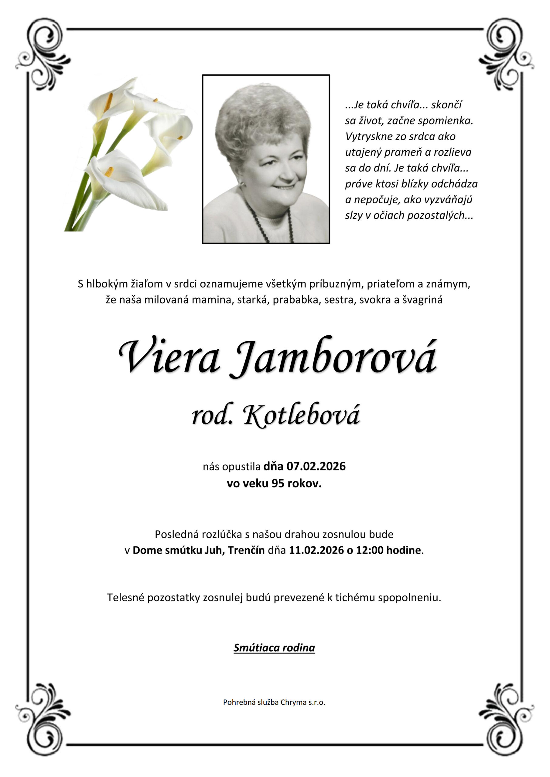 S hlbokým žiaľom oznamujeme všetkým príbuzným, priateľom a známym, že Viera Jamborová rod. Kotlebová nás opustil(a) dňa: 07.02.2026, vo veku 95 rokov. Posledná rozlúčka sa uskutoční dňa: 11.02.2026.