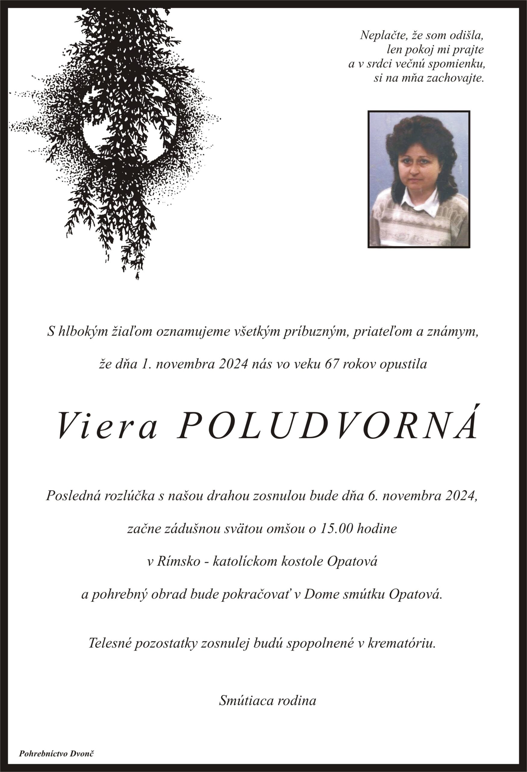 S hlbokým žiaľom oznamujeme všetkým príbuzným, priateľom a známym, že Viera Poludvorná nás opustil(a) dňa: 01.11.2024, vo veku 67 rokov. Posledná rozlúčka sa uskutoční dňa: 06.11.2024.