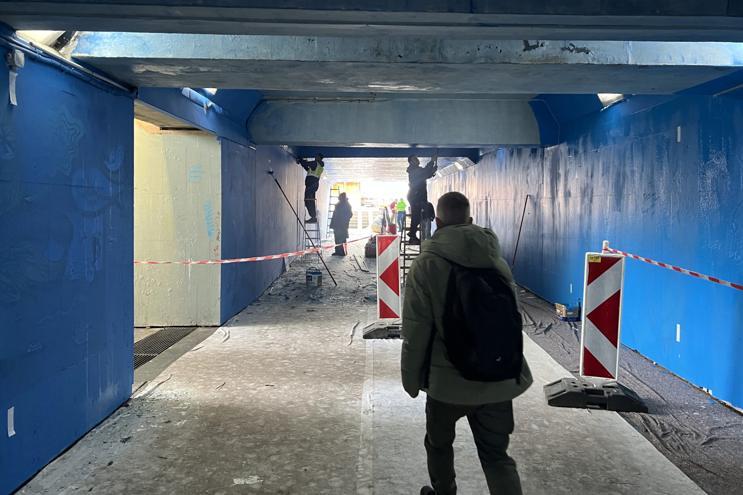 Nateraz sme steny podchodu vyčistili, opatrili penetračným náterom a zatiaľ jednou vrstvou maľovky, modrej farby. Pracuje sa aj na elektroinštalácii, ktorá bude potrebná na umiestnenie umeleckej intervencie – pôjde o päť lighboxov. Tie budú inštalované 9. februára 2026 v réžii Kreatívneho inštitútu Trenčín.