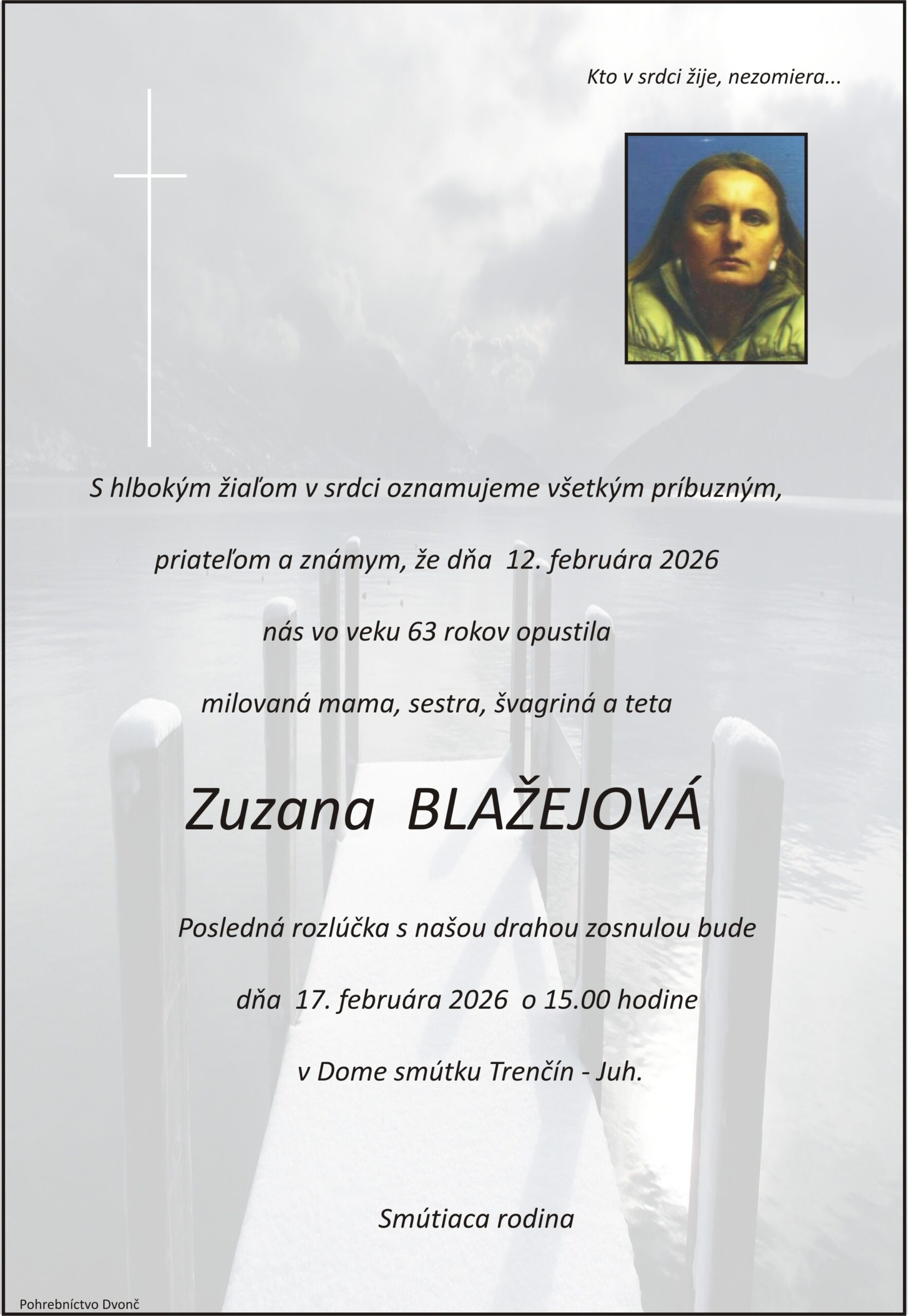 S hlbokým žiaľom oznamujeme všetkým príbuzným, priateľom a známym, že Zuzana Blažejová nás opustil(a) dňa: 12.02.2026, vo veku 63 rokov. Posledná rozlúčka sa uskutoční dňa: 17.02.2026.